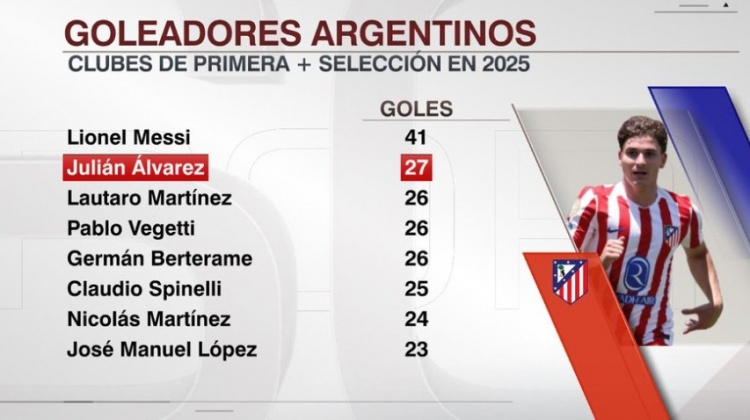 进入2025年,苏超直播阿尔瓦雷斯在俱乐部和国家队已打进27球穆帅最新准确消息今天新闻,阿根廷球员中仅次于梅西的41球。在阿尔瓦雷斯身后是劳塔罗(26球)、维格蒂(26球)、贝尔泰拉梅(26球)、斯皮内利(25球)、尼古拉斯-马丁内斯(24球)以及何塞-洛佩斯(23球)。