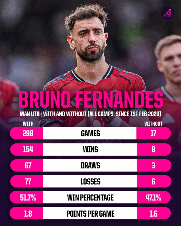 10月14日讯 Opta统计了B费加盟曼联以来出场、缺席情况下球队的战绩,苏超在线直播高清视频无插件并做出对比。