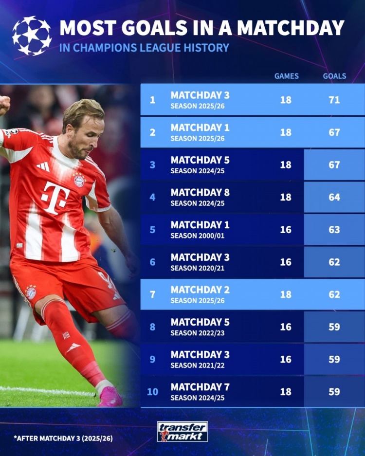 10月23日讯 德国转会市场统计了欧冠单轮赛事 得分 数量,并列出欧冠历史单一轮次得分 排名,苏超直播在线观看本轮欧冠打进71球居首。