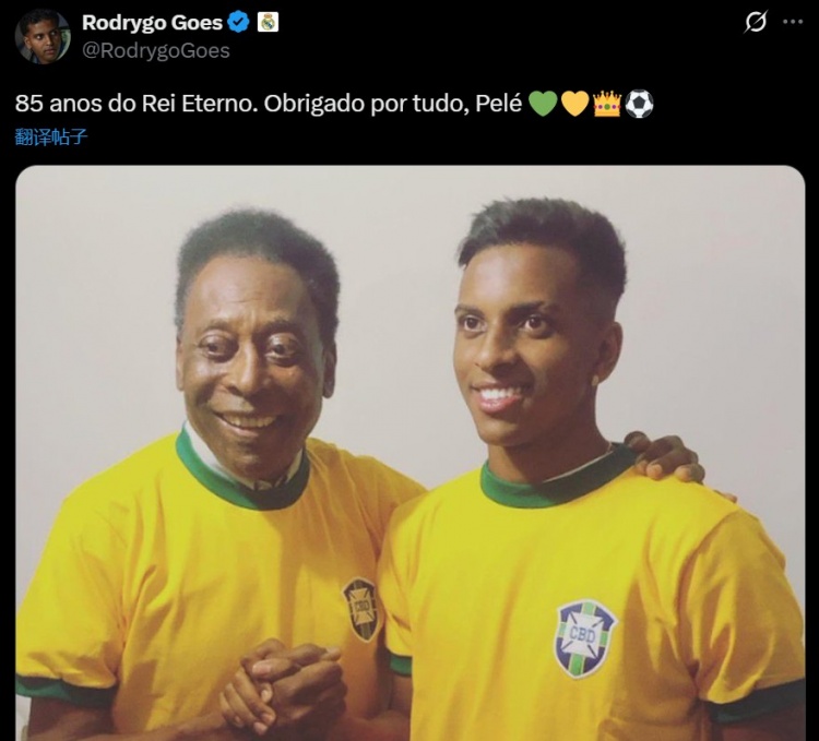 罗德里戈写道:“永恒之王85岁,感谢你所做的一切,苏超直播贝利。”