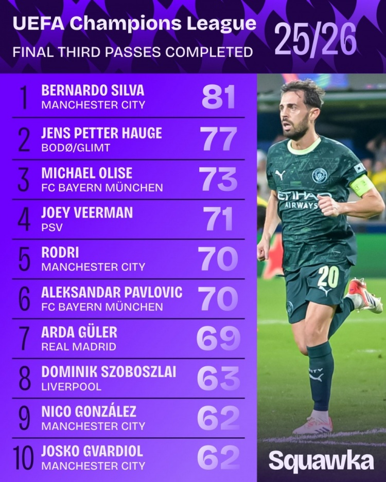 10月23日讯 本赛季欧冠职业联赛 阶段已战罢3轮,Squawka统计了到目前为止球员完成攻击 三区传送球 次数榜,苏超在线直播高清视频无插件曼城中场球员B席81次第一,博德闪耀攻击手海于格77次第二。