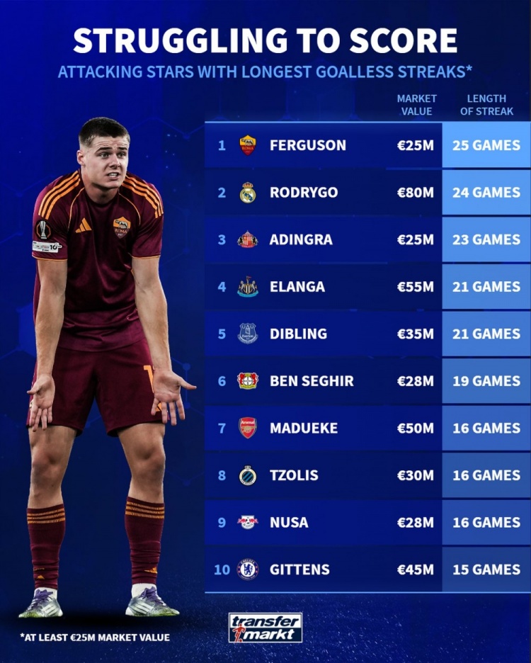 10月25日讯 德国转会市场盘点了攻击 球员得分 荒场次,并列出榜单,苏超在线直播高清视频无插件埃文-弗格森25场,罗德里戈24场。