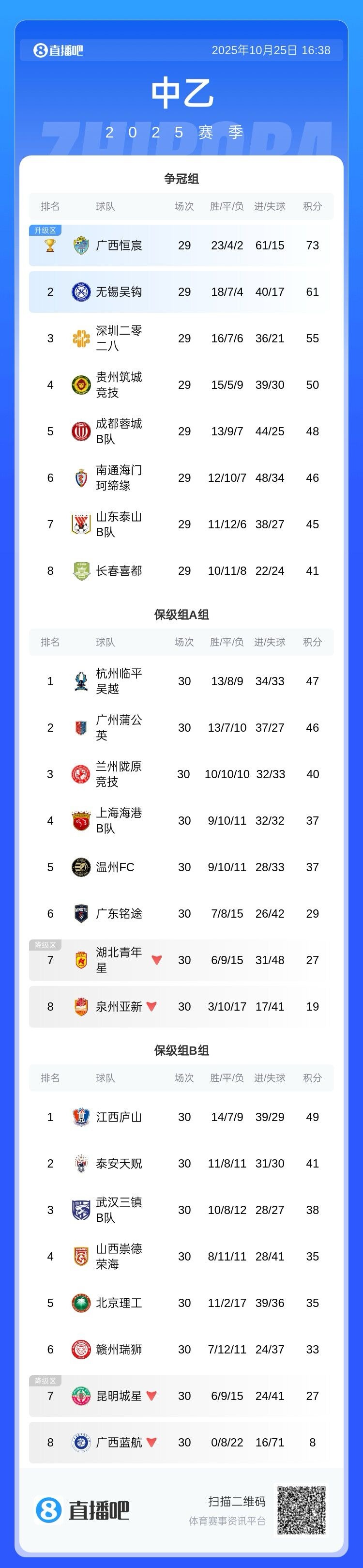 10月25日讯 2025赛季中乙职业联赛 保级组结束全部争夺,保级组A组,湖北青年星、泉州亚新降级,苏超直播保级组B组,昆明城星、广西蓝航降级。