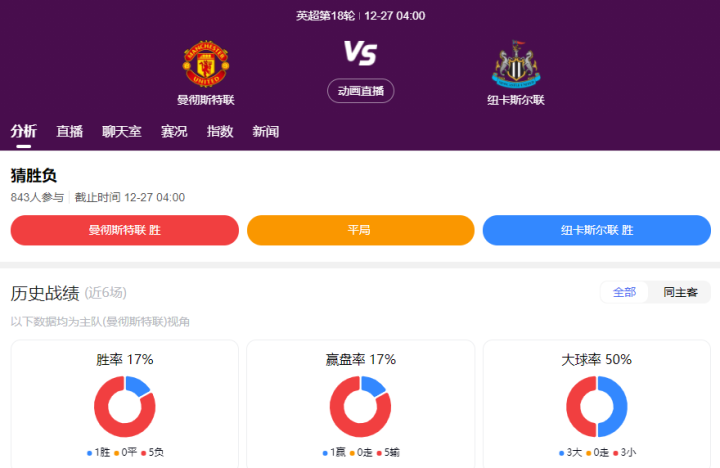 北京时间12月27日4点,英超第18轮,曼联对阵纽卡。