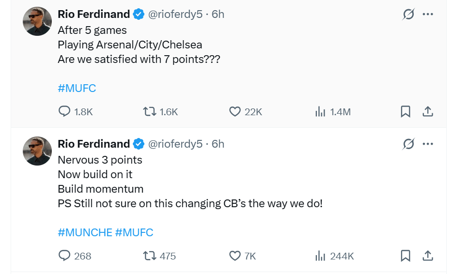 虎扑09月21日讯在此前结束的一场英超赛事 中,曼联2-1战胜了切尔西。本场赛事 ,费迪南德也在社媒上发文,谈到了他对赛事 的看法。