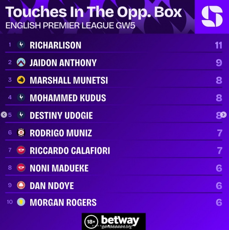 9月24日讯 英超第5轮战罢,squawkafootball列各项数据排行,苏超直播热刺前场球员理查利森是本轮在对方危险区域 触球最多的球员,共11次。