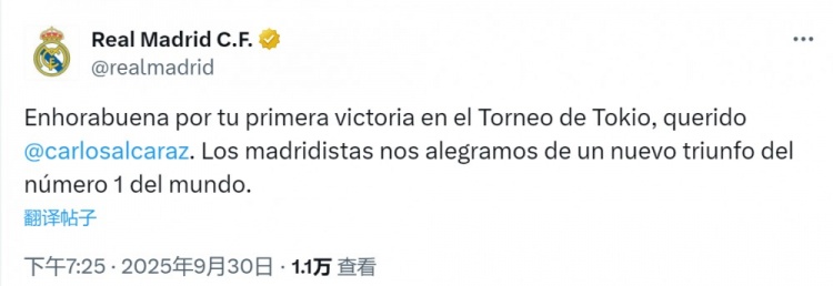 9月30日讯 西班牙网球运动活动 名将、皇击鞠 迷阿尔卡拉斯夺得ATP500东京男单第一名 ,皇马官方社媒发文祝贺。