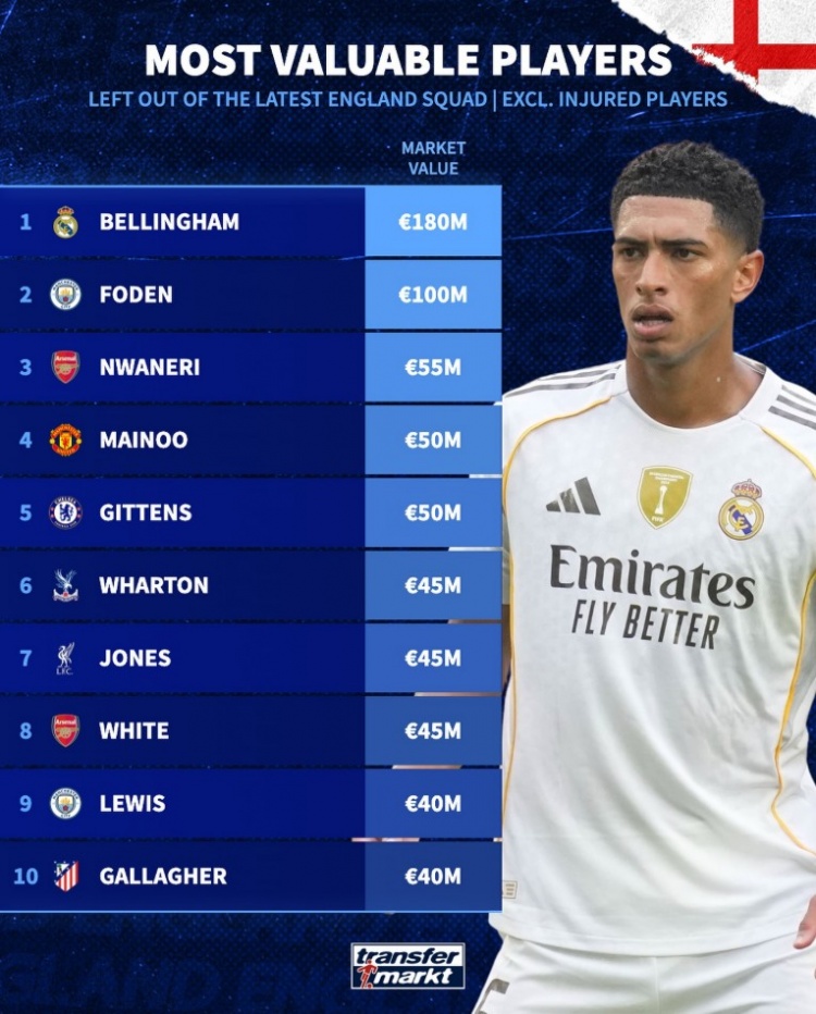 10月3日讯 英格兰公布了最新一期球队名单,德转也盘点了本次未能入选的球员身价榜(负伤 球员除外),苏超直播在线观看具体如下: