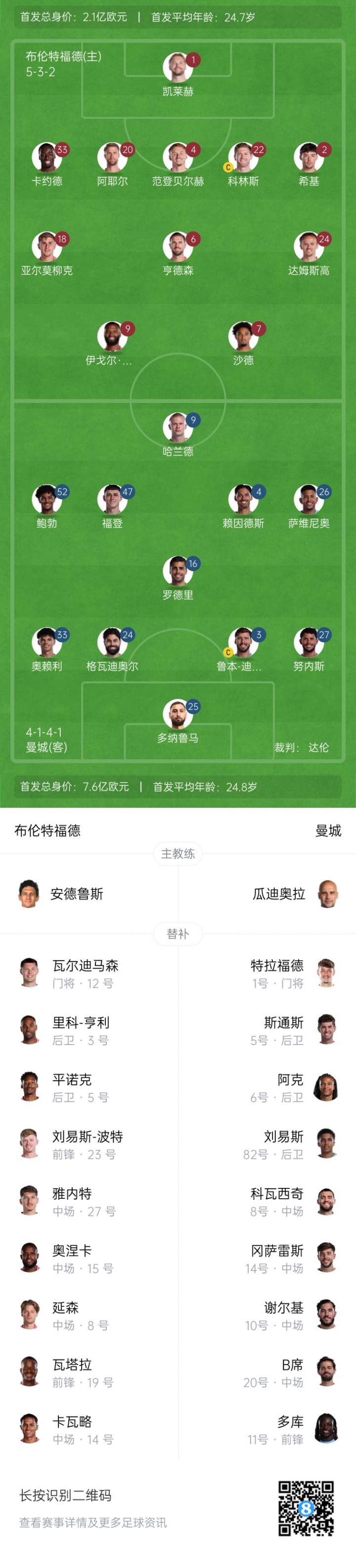 10月05日讯 北京时间今晚23点30分,英超第7轮,曼城客场应战 对阵布伦特福德,赛前双方公布杆位阵形 。