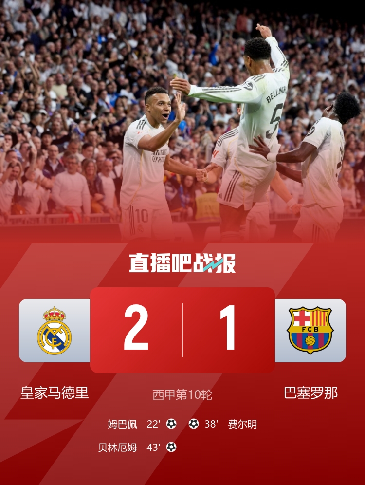 10月27日讯 西甲第10轮,皇马2-1击败巴萨,西甲开局9胜1负5分领跑,巴萨排第2。