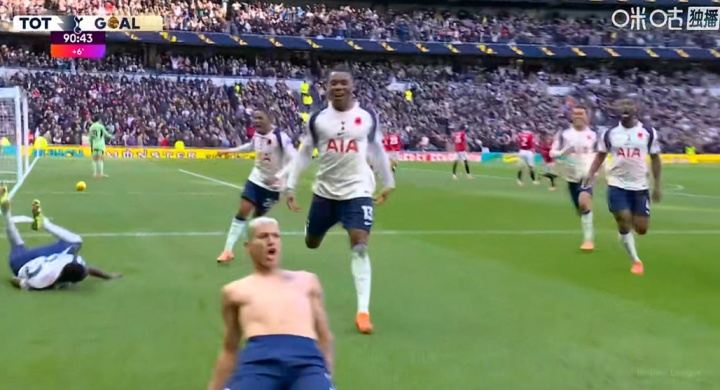 11月08日讯 今日英超曼联客战热刺,赛事 第91分钟里沙利松破门反超曼联!得分 后里沙利松脱衣热血 庆祝,苏超直播在线观看随后捂脸情难自已。