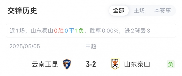 目前,山东泰山12胜6平7负积42分位列中超第6,近6轮赛事 泰山4胜2平保持不败;云南玉昆8胜7平10负积31分位列中超第10,球队近期3负2平连续五轮不胜。本赛季双方首局 赛事 ,泰山遭玉昆让二追三反转 。